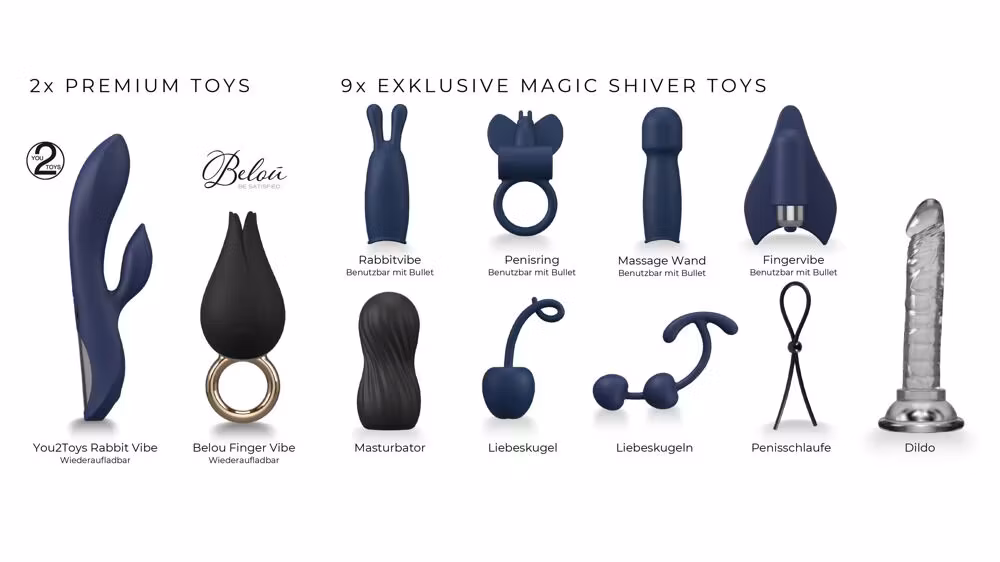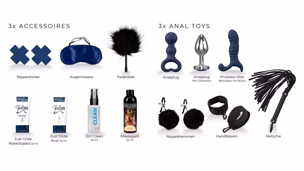 Contents: 2 x premium toys, 9 x toys, 3 x anal toys, 3 x accessories, 4 x liquids, 3 x soft bondage.