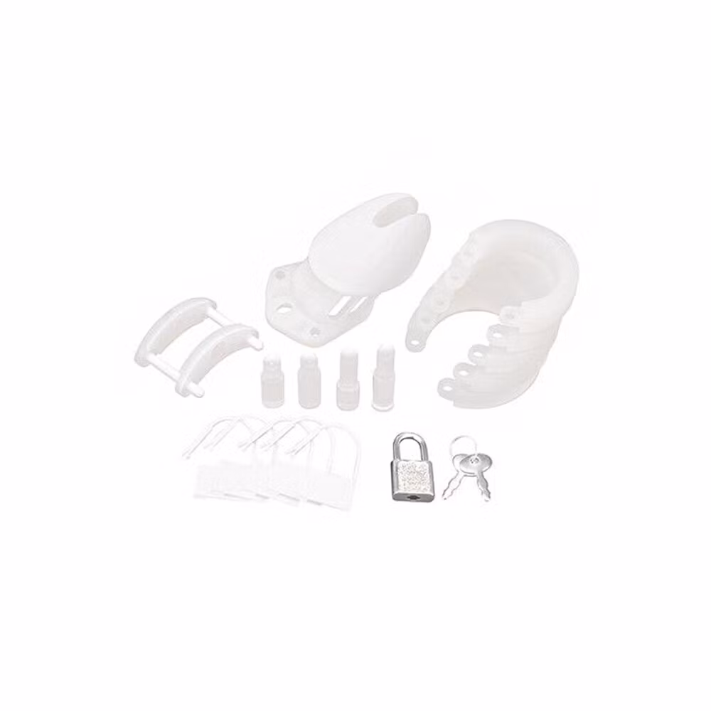The Silicone Chastity Cage Device offers the best of comfort and security. The rings consist of three interlocking pieces that fit together. The two guide pins hold the top pieces together. The oval locking pin goes through the middle recessed hole connecting the cage portion to the ring. Assorted size rings and spacers included in each package allow you to customize the fit. Restricts you from touching your genitals for sexual pleasure and gives the keyholder control over the sexual fulfilment.