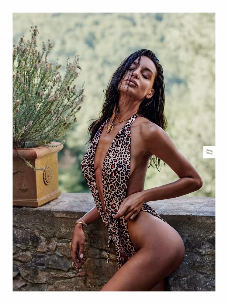 Badedrakt Cancunella i trendy leostil, fra Obsessives serie Swimwear 2022. Utringet til navelen foran, med knyting i livet. Ryggen er helt fri. Den høye benskjæringen tryller fram ekstra lange ben. Mykt, elastisk materiale som gir perfekt passform under bading, soling og svømming.