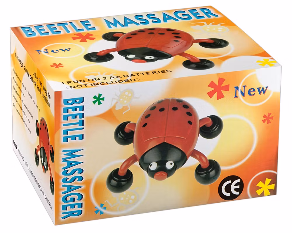 For dyrisk opphissende massasje! Massasjeapparat formet som en marihøne. Bruk de fire bena med massasjekuler der hvor du er stiv og støl. Når du trykker på nesen begynner den å vibrere kraftig! Rød/svart, 12 cm lang, 14 cm bred, 8 cm høy.