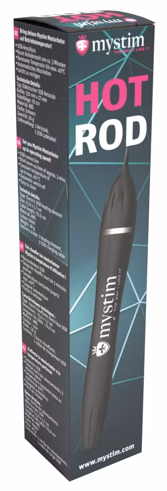 Varmestav, kompatibel med Mystims masturbatorer, f.eks. Opus Mica. Den korte oppvarmingstida gir selv den kjøligste masturbator behagelig temperatur på null komma niks. Red Hot Rod er enkel å rengjøre og den skrur seg av automatisk når maksimaltemperaturen på 45°C oppnås, det betyr at en konstant temperatur holdes.