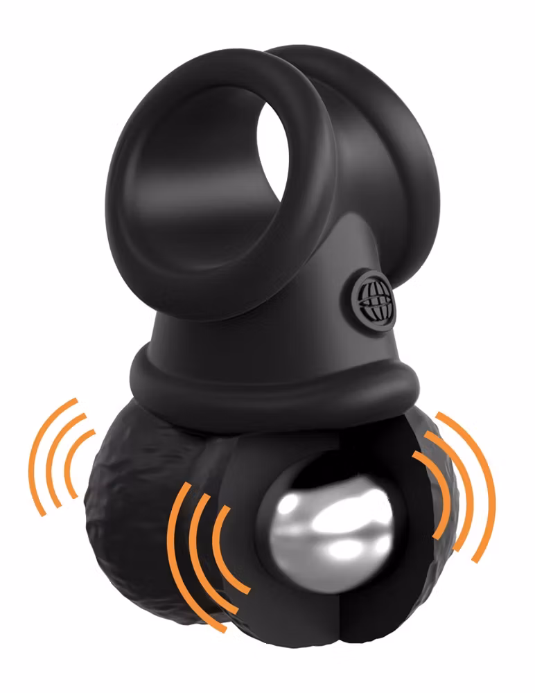 Penisring The Crown Juwels - Vibrating Swinging Balls fra King Cock Elite med pendlende vibroballer med lodd. De naturtro ballene i Dual Density silikon har myk, smidig struktur og inni er det to kulelodd. Ved hvert eneste støt pendler ballene vibrerende naturtro med deilige klask mot intimområdet.