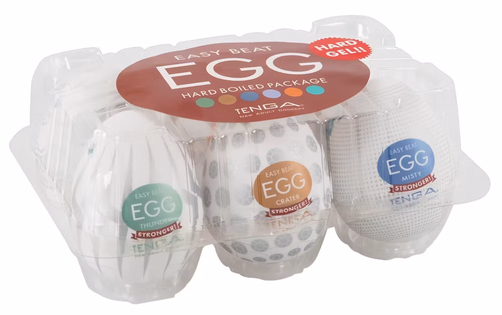 Seks forskjellige eggeformede engangs-masturbatorer med ulik pirrestruktur inni (nå enda tykkere). Bruken er eggende enkel. Ta egget ut av skallet, bruk rikelig glidemiddel og tre det over penis. Så kan du føle pirrestrukturen som masserer penis ekstatisk mens du glir ut og inn. Masturbatorene er 7 cm lange, og har tøyelig diameter, slik at de er egnet til alle penisstørrelser. Materiale: TPE, PP. 6 stykk, pakket i en gjennomsiktig eske. Inklusive glidemiddel.