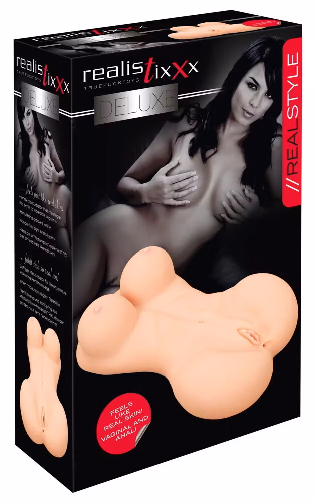 Realistisk formet torsomasturbator Deluxe Woman fra realistixxx med store pupper og detaljert formet vagina- og anusåpning. Lystkanalene er pirrestrukturert med nupper og riller.