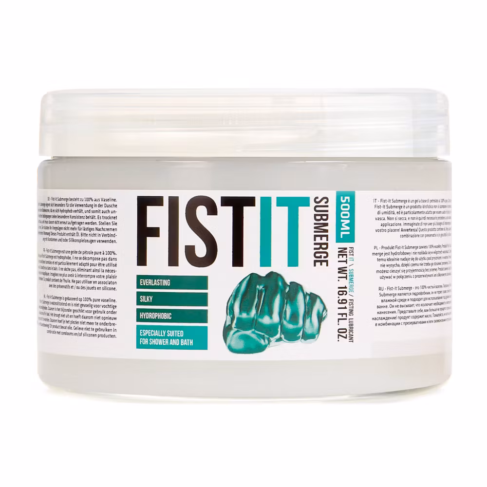 Fist It Submerge is a 100 percent pure petroleum jelly. Because Fist-It Submerge is hydrophobic it does not break down in moist conditions and is especially suited to use under the shower or in the bath. It does not dry out, eliminating the need to reapply. Imagine no longer needing to interrupt your pleasure!