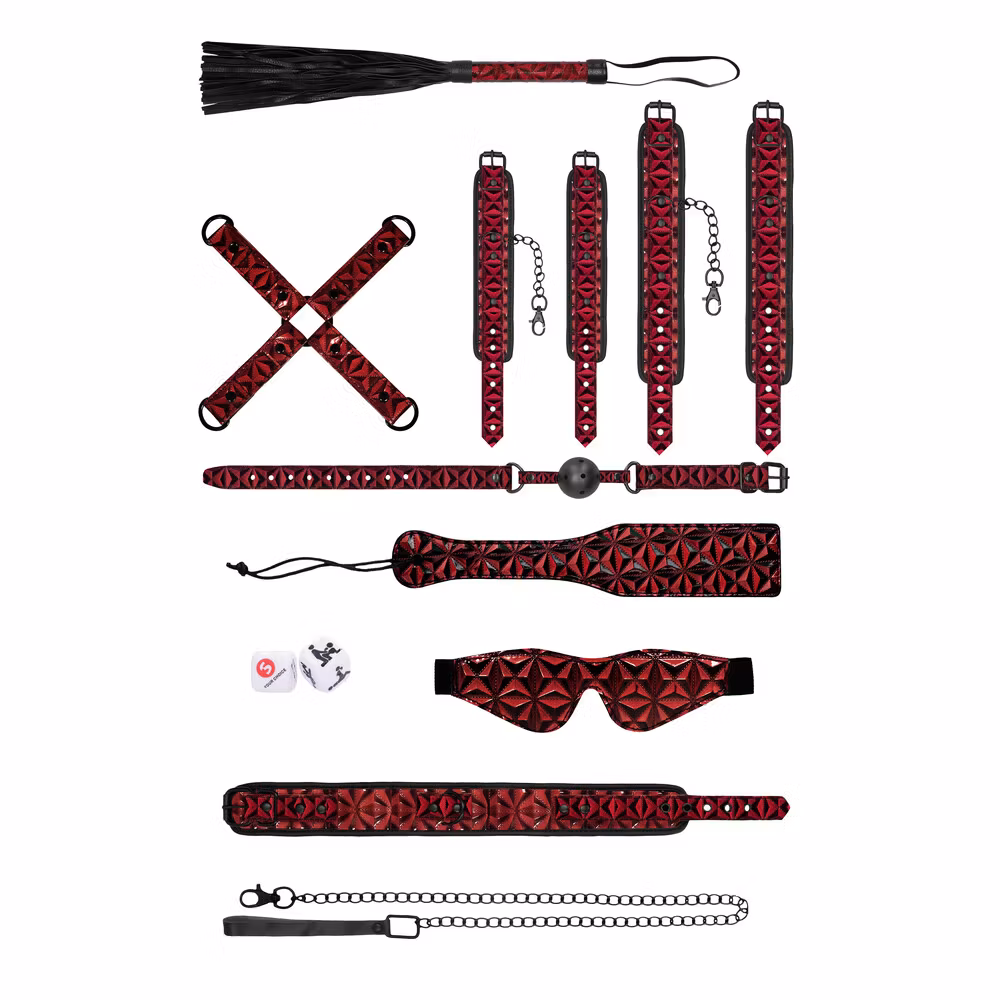 Satsen inkluderar handleds- och ankelmanschetter, ögonmask, andningsbar bollknäcka, krage med koppel, paddla, Flogger, Hogtie och tärningar